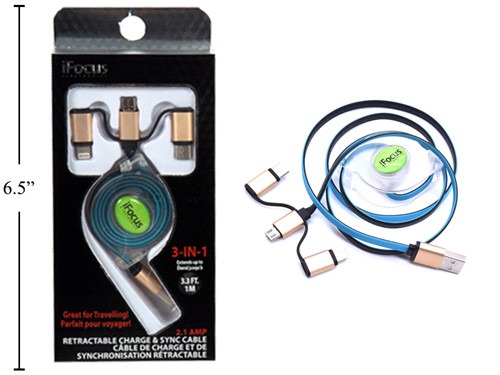 iFocus,1m(39")3-in-1 Charge&Sync retractable cable,Blue,colourbox